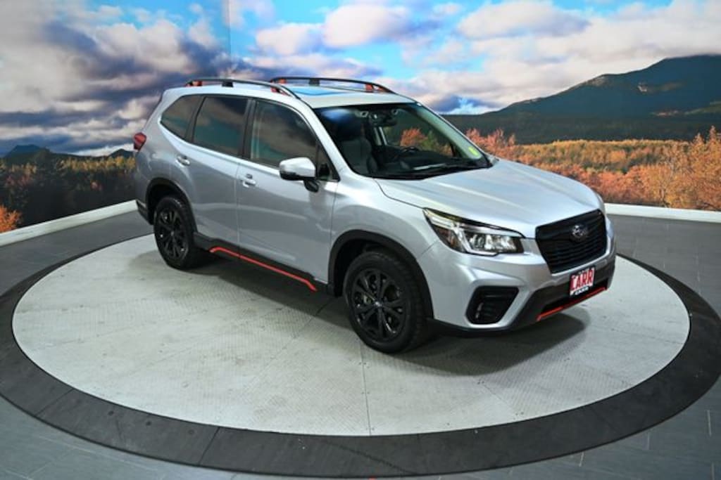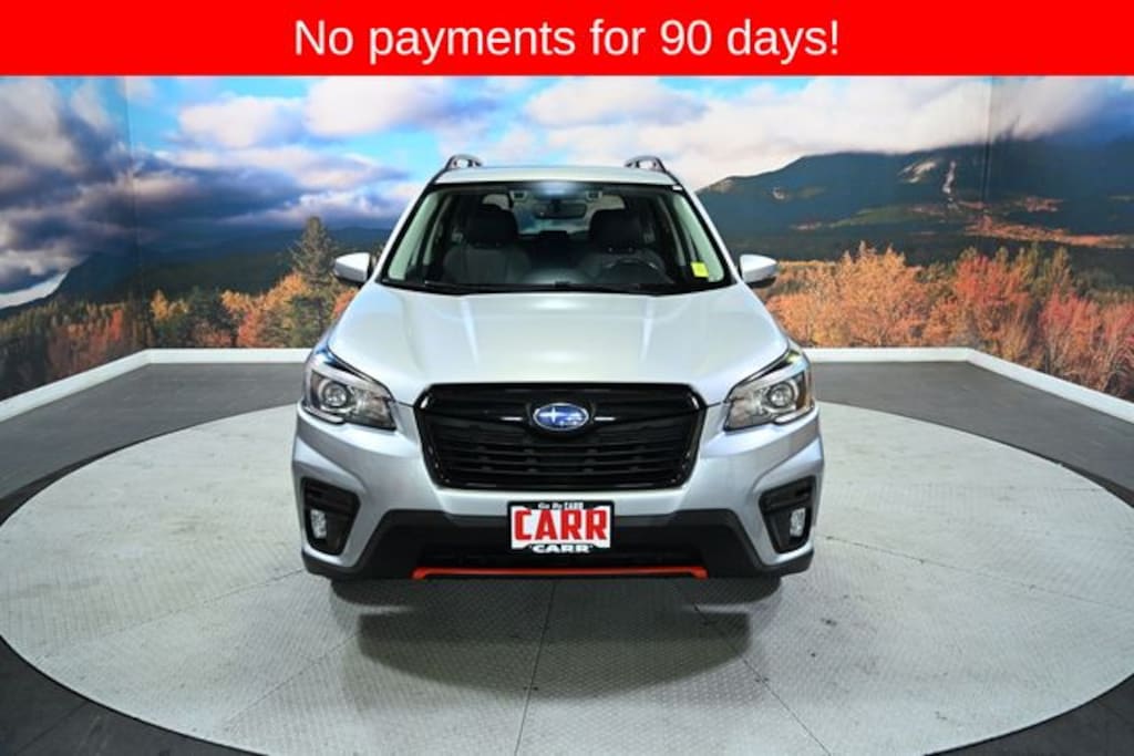 This 2019 Ice Silver Metallic Subaru Forester Sport AWD is well equipped and includes these features and benefits: Popular Package #2 (Auto-Dimming Exterior Mirror w/Approach Lighting, Auto-Dimming Mirror w/Compass & HomeLink, and Rear Bumper Cover), Carr Care Advantage Certified, 3.70 Axle Ratio, 4-Wheel Disc Brakes, 6 Speakers, ABS brakes, Active Cruise Control, Air Conditioning, Alloy wheels, AM/FM radio: SiriusXM, Auto High-beam Headlights, Automatic temperature control, Brake assist, Bumpers: body-color, CD player, Door Scuff Protector, Driver door bin, Driver vanity mirror, Dual front impact airbags, Dual front side impact airbags, Electronic Stability Control, Emergency communication system: STARLINK Safety and Security, Exterior Parking Camera Rear, Four wheel independent suspension, Front anti-roll bar, Front Bucket Seats, Front Center Armrest, Front fog lights, Front reading lights, Fully automatic headlights, Heated door mirrors, Heated Front Bucket Seats, Heated front seats, Ice Silver Metallic Door Edge Guards, Illuminated entry, Knee airbag, Leather Shift Knob, Low tire pressure warning, Occupant sensing airbag, Outside temperature display, Overhead airbag, Overhead console, Paddle-Shift Control Switches, Panic alarm, Passenger door bin, Passenger vanity mirror, Power door mirrors, Power driver seat, Power moonroof: Panoramic, Power steering, Power windows, Radio data system, Radio: Subaru Starlink 6.5" Multimedia Plus System, Rear anti-roll bar, Rear seat center armrest, Rear window defroster, Rear window wiper, Remote keyless entry, Roof rack: rails only, Security system, Speed control, Speed-sensing steering, Split folding rear seat, Spoiler, Sport Cloth Upholstery, STARLINK/Apple CarPlay/Android Auto, Steering wheel mounted audio controls, Tachometer, Telescoping steering wheel, Tilt steering wheel, Traction control, Trip computer, Turn signal indicator mirrors, Variably intermittent wipers, and Wheels: 18" x 7.0J Black Finish Aluminum Alloy. No CARR payments for 4 months, Sign and Drive sales event!, CARR Cares Advantage up to $3100 in ownership savings, Great value AWD Subaru.