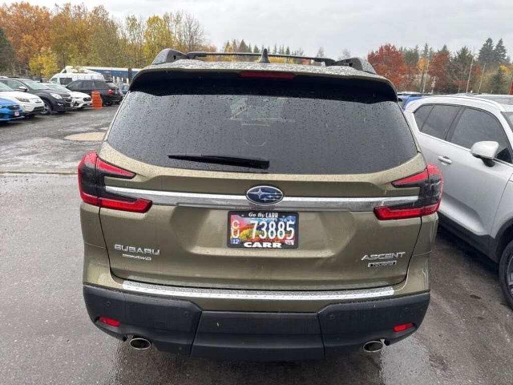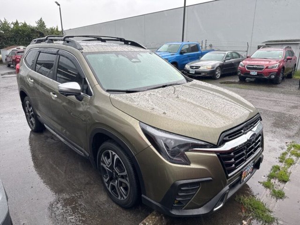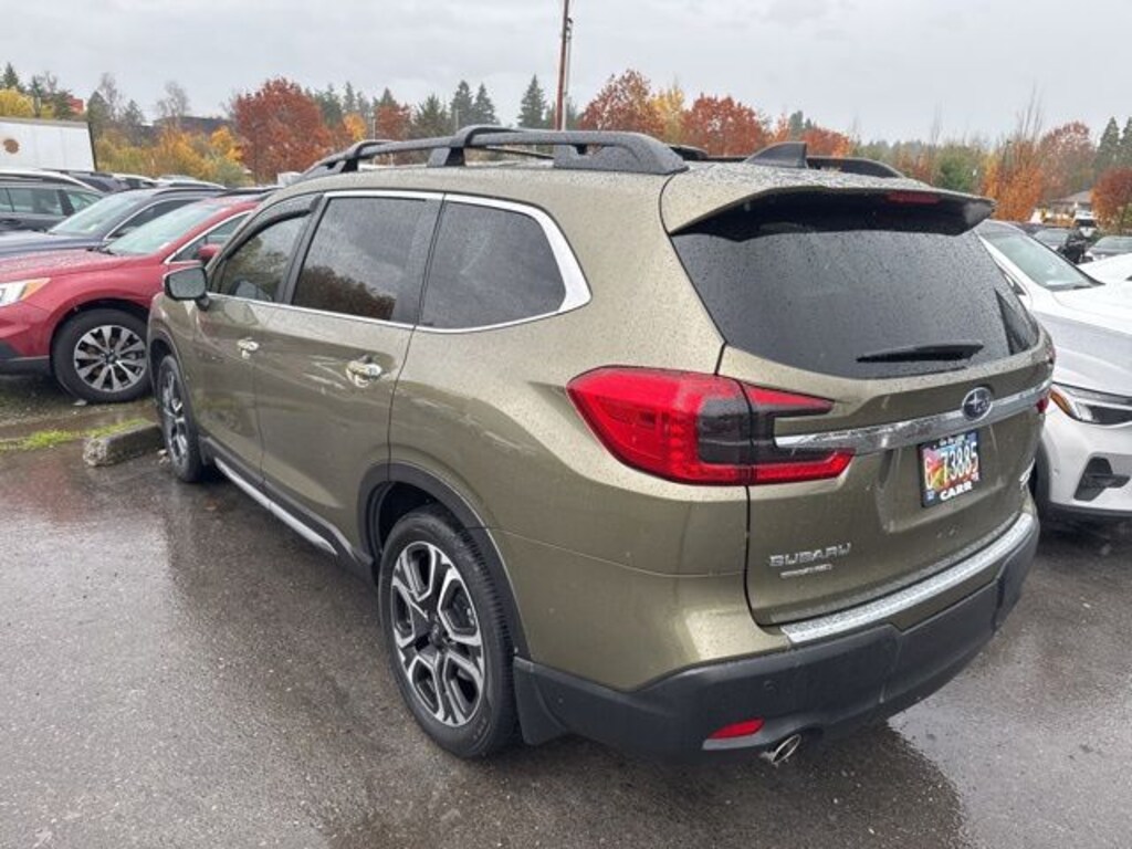 This 2023 Green Metallic Subaru Ascent Touring AWD is well equipped and includes these features and benefits: Standard Model, harman/kardon® Speakers, Power Liftgate, Power moonroof, 14 Speakers, 3rd Row Bench Rear Seatback Protector, 3rd row seats: bench, 4-Wheel Disc Brakes, ABS brakes, Aero Crossbar Set, Air Conditioning, All-Weather Floor Liners, Alloy wheels, AM/FM radio: SiriusXM, Auto High-beam Headlights, Auto-Dimming Exterior Mirror w/Approach Light, Auto-dimming Rear-View mirror, Automatic temperature control, Axle Ratio: 4.44, Brake assist, Bumpers: body-color, Cargo Tray, Compass, Delay-off headlights, Driver door bin, Driver vanity mirror, Dual front impact airbags, Dual front side impact airbags, Electronic Stability Control, Emergency communication system: STARLINK Safety and Security (Subscription Required), Four wheel independent suspension, Front anti-roll bar, Front Bucket Seats, Front Center Armrest, Front dual zone A/C, Front fog lights, Front reading lights, Fully automatic headlights, Garage door transmitter: HomeLink, Heated & Ventilated Front Bucket Seats, Heated door mirrors, Heated front seats, Heated rear seats, Heated steering wheel, HVAC memory, Illuminated entry, Knee airbag, Leather Shift Knob, Leather steering wheel, Low tire pressure warning, Memory seat, Navigation System, Occupant sensing airbag, Outside temperature display, Overhead airbag, Overhead console, Panic alarm, Passenger door bin, Passenger vanity mirror, Perforated Nappa Leather-Trimmed Upholstery, Power door mirrors, Power driver seat, Power passenger seat, Power steering, Power windows, Radio data system, Radio: Subaru STARLINK 11.6" Multimedia Nav System, Rain sensing wipers, Rear air conditioning, Rear anti-roll bar, Rear Bumper Cover, Rear reading lights, Rear window defroster, Rear window wiper, Reclining 3rd row seat, Remote keyless entry, Security system, Speed control, Speed-sensing steering, Splash Guards, Split folding rear seat, Spoiler, STARLINK/Apple CarPlay/Android Auto, Steering wheel mounted audio controls, Tachometer, Telescoping steering wheel, Tilt steering wheel, Traction control, Trip computer, Turn signal indicator mirrors, Variably intermittent wipers, Ventilated front seats, and Wheels: 20" x 7.5 J Dk Gray Alloy w/Machine Finish. Lifetime powertrain warranty, No CARR payments for 4 months, Sign and Drive sales event!, CARR Cares Advantage up to $3100 in ownership savings, Touring, One owner, harman/kardon® Speakers, Power Liftgate, Power moonroof.