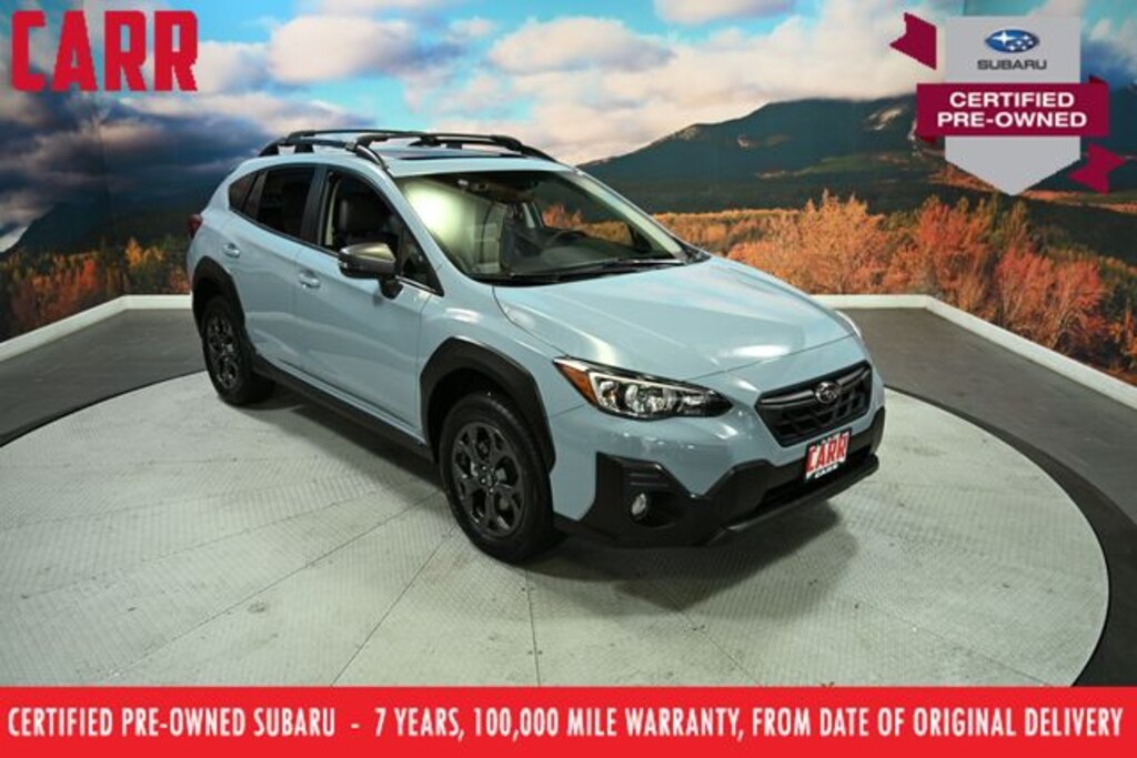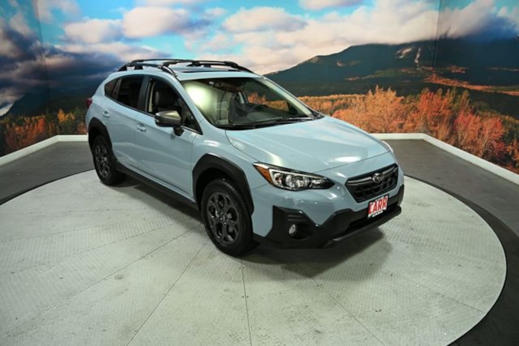 This 2023 Cool-Gray Khaki Subaru Crosstrek Sport AWD is well equipped and includes these features and benefits: Moonroof & BSD w/RCTA & 8.0" Multimedia Plus Audio (Blind Spot Detection w/Rear Cross-Traffic Alert, Power Moonroof, and Radio: Subaru STARLINK 8.0" Multimedia Plus System), Subaru Certified Pre-Owned Certified, Remote keyless entry, 3.70 Axle Ratio, 4-Wheel Disc Brakes, 6 Speakers, ABS brakes, Aero Crossbar Set, Air Conditioning, Alloy wheels, AM/FM radio: SiriusXM, Anti-whiplash front head restraints, Auto-Dimming Exterior Mirror w/Approach Light, Auto-Dimming Mirror w/Compass, Automatic temperature control, Brake assist, Bumpers: body-color, Cargo Net, CD player, Driver door bin, Driver vanity mirror, Dual front impact airbags, Dual front side impact airbags, Electronic Stability Control, Emergency communication system: STARLINK Safety and Security (Subscription Required), Exterior Parking Camera Rear, Four wheel independent suspension, Front anti-roll bar, Front Bucket Seats, Front Center Armrest, Front fog lights, Front reading lights, Fully automatic headlights, Heated door mirrors, Heated Front Bucket Seats, Heated front seats, Illuminated entry, Knee airbag, Leather Shift Knob, Low tire pressure warning, Occupant sensing airbag, Outside temperature display, Overhead airbag, Overhead console, Panic alarm, Passenger door bin, Passenger vanity mirror, Power door mirrors, Power steering, Power windows, Radio data system, Radio: Subaru STARLINK 6.5" Multimedia Plus System, Rear anti-roll bar, Rear Bumper Cover, Rear Seatback Protector, Rear window defroster, Rear window wiper, Security system, Speed control, Speed-sensing steering, Split folding rear seat, Spoiler, STARLINK/Apple CarPlay/Android Auto, StarTex Upholstery, Steering wheel mounted audio controls, Tachometer, Telescoping steering wheel, Tilt steering wheel, Traction control, Trip computer, Turn signal indicator mirrors, Variably intermittent wipers, and Wheels: 17" x 7.0J Alum Alloy Dark Gray Met Finish. Subaru Certified Pre-Owned, 7 year or 100,000-mile Subaru Certified warranty, No CARR payments for 4 months, Sign and Drive sales event!, CARR Cares Advantage up to $3100 in ownership savings, One owner, Blind Spot Detection w/Rear Cross-Traffic Alert, Moonroof & BSD w/RCTA & 8.0" Multimedia Plus Audio, Power Moonroof, Radio: Subaru STARLINK 8.0" Multimedia Plus System, Remote keyless entry.