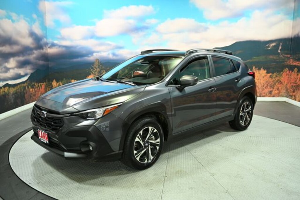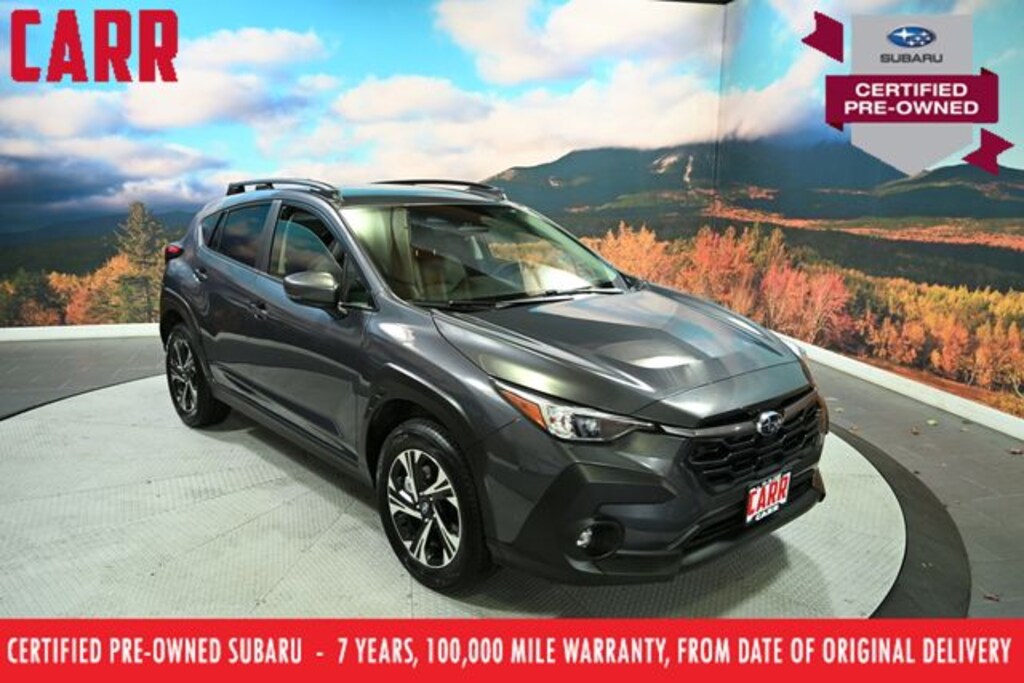 This 2024 Magnetite Gray Metallic Subaru Crosstrek Premium AWD is well equipped and includes these features and benefits: Crosstrek Mirror Package (Auto-Dimming Exterior Mirror w/Approach Light and Auto-Dimming Mirror w/Compass & HomeLink), Standard Model, Subaru Certified Pre-Owned Certified, 3.90 Axle Ratio, 4-Wheel Disc Brakes, 6 Speakers, ABS brakes, Air Conditioning, All-Weather Floor Liners, Alloy wheels, AM/FM radio: SiriusXM, Anti-whiplash front head restraints, Auto High-beam Headlights, Automatic temperature control, Brake assist, Bumpers: body-color, Cargo Net, Driver door bin, Driver vanity mirror, Dual front impact airbags, Dual front side impact airbags, Electronic Stability Control, Emergency communication system: STARLINK Safety and Security (Subscription Required), Exterior Parking Camera Rear, Four wheel independent suspension, Front anti-roll bar, Front Bucket Seats, Front Center Armrest, Front dual zone A/C, Front fog lights, Front reading lights, Fully automatic headlights, Illuminated entry, Knee airbag, Low tire pressure warning, Occupant sensing airbag, Outside temperature display, Overhead airbag, Overhead console, Panic alarm, Passenger door bin, Passenger vanity mirror, Power door mirrors, Power steering, Power windows, Premium Cloth Upholstery, Radio data system, Radio: Subaru STARLINK 11.6" Multimedia Plus Sys, Rear anti-roll bar, Rear seat center armrest, Rear window defroster, Rear window wiper, Remote keyless entry, Security system, Speed control, Speed-sensing steering, Split folding rear seat, Spoiler, STARLINK/Apple CarPlay/Android Auto, Steering wheel mounted audio controls, Tachometer, Telescoping steering wheel, Tilt steering wheel, Traction control, Trip computer, Turn signal indicator mirrors, Variably intermittent wipers, and Wheels: 17" x 7.0J Dark Gray Aluminum Alloy.