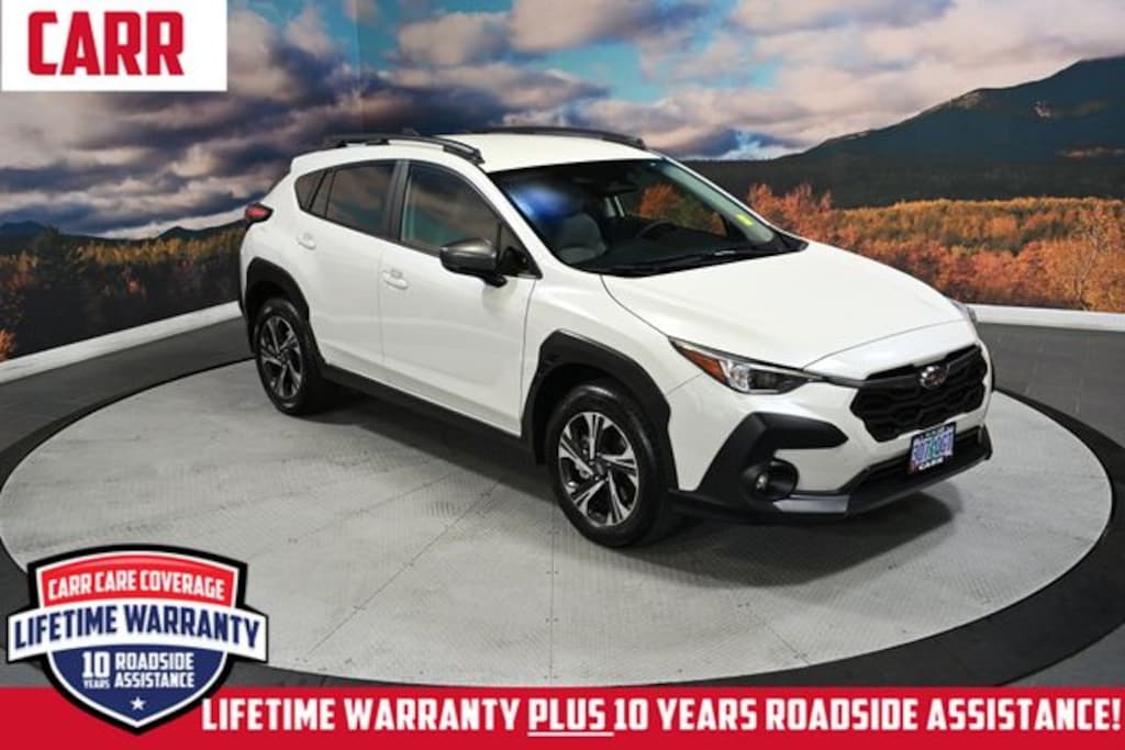 This 2024 Crystal White Pearl Subaru Crosstrek Premium AWD is well equipped and includes these features and benefits: Carr Care Advantage Certified, 3.90 Axle Ratio, 4-Wheel Disc Brakes, 6 Speakers, ABS brakes, Active Cruise Control, Air Conditioning, Alloy wheels, AM/FM radio: SiriusXM, Anti-whiplash front head restraints, Auto High-beam Headlights, Auto-Dimming Exterior Mirror w/Approach Light (DIO), Automatic temperature control, Brake assist, Bumpers: body-color, Driver door bin, Driver vanity mirror, Dual front impact airbags, Dual front side impact airbags, Electronic Stability Control, Emergency communication system: STARLINK Safety and Security (Subscription Required), Exterior Parking Camera Rear, Four wheel independent suspension, Front anti-roll bar, Front Bucket Seats, Front Center Armrest, Front dual zone A/C, Front fog lights, Front reading lights, Fully automatic headlights, Illuminated entry, Knee airbag, Low tire pressure warning, Occupant sensing airbag, Outside temperature display, Overhead airbag, Overhead console, Panic alarm, Passenger door bin, Passenger vanity mirror, Power door mirrors, Power steering, Power windows, Premium Cloth Upholstery, Radio data system, Radio: Subaru STARLINK 11.6" Multimedia Plus Sys, Rear anti-roll bar, Rear seat center armrest, Rear window defroster, Rear window wiper, Remote keyless entry, Security system, Speed control, Speed-sensing steering, Split folding rear seat, Spoiler, STARLINK/Apple CarPlay/Android Auto, Steering wheel mounted audio controls, Tachometer, Telescoping steering wheel, Tilt steering wheel, Traction control, Trip computer, Turn signal indicator mirrors, Variably intermittent wipers, and Wheels: 17" x 7.0J Dark Gray Aluminum Alloy. Lifetime powertrain warranty, No CARR payments for 4 months, Sign and Drive sales event!, CARR Cares Advantage up to $3100 in ownership savings.