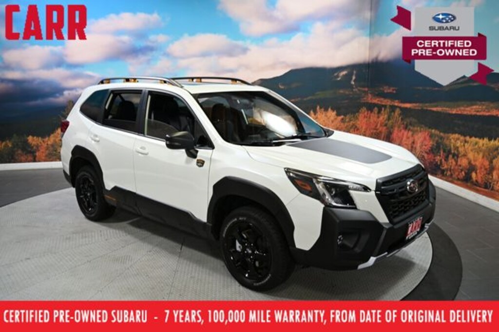 This 2024 Crystal White Pearl Subaru Forester Wilderness AWD is well equipped and includes these features and benefits: 8" Audio w/harman/kardon & Power Rear Gate (harman/kardon 9-Speaker Audio System, Power Rear Gate, and Radio: Subaru STARLINK 8.0" Multimedia Nav System), Wilderness Package (Auto-Dimming Exterior Mirror w/Approach Light, Auto-Dimming Mirror w/Compass & HomeLink, Cargo Sidewall Protector, Rear Bumper Cover, and Rear Seatback Protector - Wilderness), Subaru Certified Pre-Owned Certified, 4-Wheel Disc Brakes, 4.11 Axle Ratio, 6 Speakers, ABS brakes, Air Conditioning, Alloy wheels, AM/FM radio: SiriusXM, Anti-whiplash front head restraints, Auto High-beam Headlights, Automatic temperature control, Brake assist, Bumpers: body-color, Driver door bin, Driver vanity mirror, Dual front impact airbags, Dual front side impact airbags, Electronic Stability Control, Emergency communication system: STARLINK Safety and Security (Subscription Required), Exterior Parking Camera Rear, Four wheel independent suspension, Front anti-roll bar, Front Bucket Seats, Front Center Armrest, Front dual zone A/C, Front fog lights, Front reading lights, Fully automatic headlights, Heated door mirrors, Heated Front Bucket Seats, Heated front seats, Illuminated entry, Knee airbag, Leather Shift Knob, Leather steering wheel, Low tire pressure warning, Navigation System, Occupant sensing airbag, Outside temperature display, Overhead airbag, Overhead console, Panic alarm, Passenger door bin, Passenger vanity mirror, Power door mirrors, Power driver seat, Power moonroof: Panoramic, Power steering, Power windows, Radio data system, Radio: Subaru STARLINK 8.0" Multimedia Plus System, Rear anti-roll bar, Rear seat center armrest, Rear window defroster, Rear window wiper, Remote keyless entry, Roof rack: rails only, Security system, Speed control, Speed-sensing steering, Split folding rear seat, Spoiler, STARLINK/Apple CarPlay/Android Auto, Steering wheel mounted audio controls, Tachometer, Telescoping steering wheel, Textured StarTex Upholstery, Tilt steering wheel, Traction control, Trip computer, Turn signal indicator mirrors, Variably intermittent wipers, and Wheels: 17" x 7.0 J Matte Black Finish Alum-Alloy. Subaru Certified Pre-Owned, 7 year or 100,000-mile Subaru Certified warranty, No CARR payments for 4 months, Sign and Drive sales event!, CARR Cares Advantage up to $3100 in ownership savings, 8" Audio w/harman/kardon & Power Rear Gate, Auto-Dimming Exterior Mirror w/Approach Light, Auto-Dimming Mirror w/Compass & HomeLink, Cargo Sidewall Protector, harman/kardon 9-Speaker Audio System, Power Rear Gate, Radio: Subaru STARLINK 8.0" Multimedia Nav System, Rear Bumper Cover, Rear Seatback Protector - Wilderness, Wilderness Package.