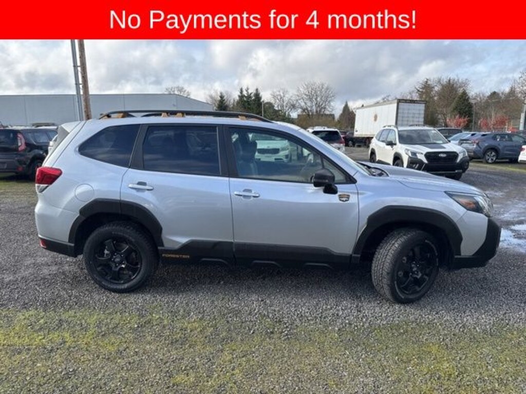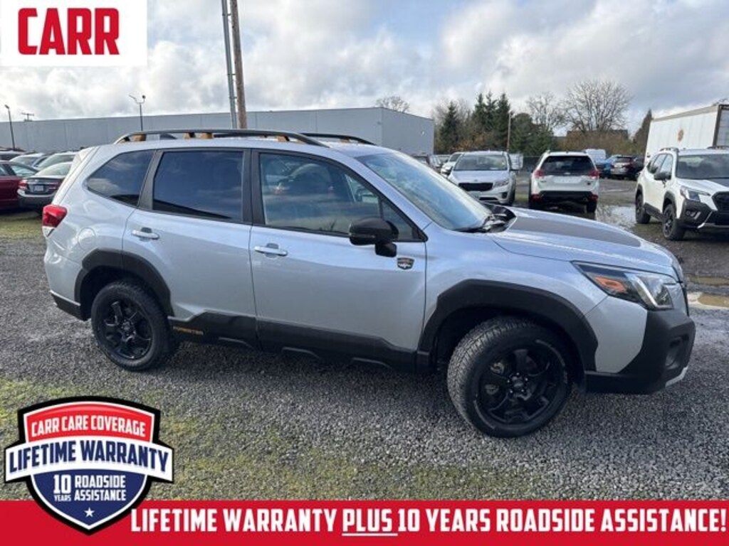 This 2024 Ice Silver Metallic Subaru Forester Wilderness AWD is well equipped and includes these features and benefits: 8" Audio w/harman/kardon & Power Rear Gate (harman/kardon 9-Speaker Audio System, Power Rear Gate, and Radio: Subaru STARLINK 8.0" Multimedia Nav System), Wilderness Package (Auto-Dimming Exterior Mirror w/Approach Light, Auto-Dimming Mirror w/Compass & HomeLink, Cargo Sidewall Protector, Rear Bumper Cover, and Rear Seatback Protector - Wilderness), Carr Care Advantage Certified, 4-Wheel Disc Brakes, 4.11 Axle Ratio, 6 Speakers, ABS brakes, Air Conditioning, Alloy wheels, AM/FM radio: SiriusXM, Anti-whiplash front head restraints, Auto High-beam Headlights, Automatic temperature control, Brake assist, Bumpers: body-color, Driver door bin, Driver vanity mirror, Dual front impact airbags, Dual front side impact airbags, Electronic Stability Control, Emergency communication system: STARLINK Safety and Security (Subscription Required), Exterior Parking Camera Rear, Four wheel independent suspension, Front anti-roll bar, Front Bucket Seats, Front Center Armrest, Front dual zone A/C, Front fog lights, Front reading lights, Fully automatic headlights, Heated door mirrors, Heated Front Bucket Seats, Heated front seats, Illuminated entry, Knee airbag, Leather Shift Knob, Leather steering wheel, Low tire pressure warning, Navigation System, Occupant sensing airbag, Outside temperature display, Overhead airbag, Overhead console, Panic alarm, Passenger door bin, Passenger vanity mirror, Power door mirrors, Power driver seat, Power moonroof: Panoramic, Power steering, Power windows, Radio data system, Radio: Subaru STARLINK 8.0" Multimedia Plus System, Rear anti-roll bar, Rear seat center armrest, Rear window defroster, Rear window wiper, Remote keyless entry, Roof rack: rails only, Security system, Speed control, Speed-sensing steering, Split folding rear seat, Spoiler, STARLINK/Apple CarPlay/Android Auto, Steering wheel mounted audio controls, Tachometer, Telescoping steering wheel, Textured StarTex Upholstery, Tilt steering wheel, Traction control, Trip computer, Turn signal indicator mirrors, Variably intermittent wipers, and Wheels: 17" x 7.0 J Matte Black Finish Alum-Alloy. No CARR payments for 4 months, Sign and Drive sales event!, CARR Cares Advantage up to $3100 in ownership savings, Lifetime powertrain warranty, 8" Audio w/harman/kardon & Power Rear Gate, Auto-Dimming Exterior Mirror w/Approach Light, Auto-Dimming Mirror w/Compass & HomeLink, Cargo Sidewall Protector, harman/kardon 9-Speaker Audio System, Power Rear Gate, Radio: Subaru STARLINK 8.0" Multimedia Nav System, Rear Bumper Cover, Rear Seatback Protector - Wilderness, Wilderness Package.