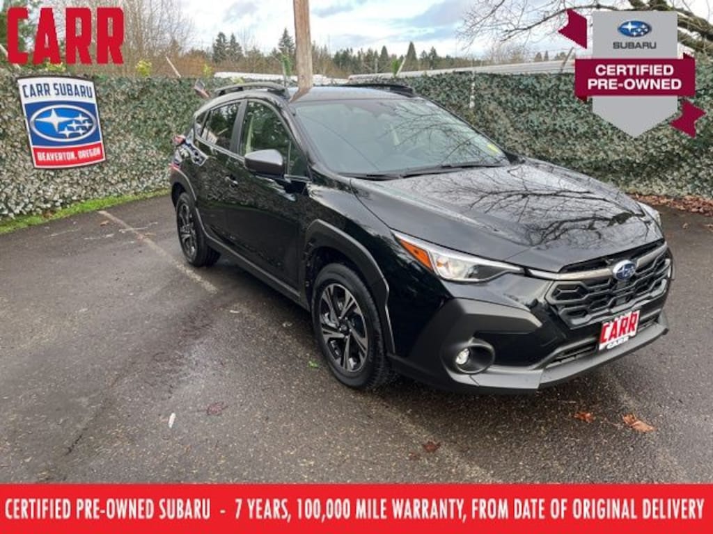 This 2025 Crystal Black Silica Subaru Crosstrek Premium AWD is well equipped and includes these features and benefits: All-Weather Package (Dual-Mode Heated Front Seats, Heated Power Exterior Mirrors, and Windshield De-Icer Wipers), BSD/RCTA & All Wthr Pkg & Pwr Dr. Seat & Pwr Moonrf (10-Way Power Driver's Seat, Blind Spot Detection (BSD), Power Moonroof, and Rear Cross-Traffic Alert (RCTA) System), Crosstrek Mirror Package (Auto-Dimming Exterior Mirror w/Approach Light and Auto-Dimming Mirror w/Compass & HomeLink), Subaru Certified Pre-Owned Certified, 4-Wheel Disc Brakes, 6 Speakers, ABS brakes, Active Cruise Control, Air Conditioning, Alloy wheels, AM/FM radio: SiriusXM, Anti-whiplash front head restraints, Auto High-beam Headlights, Automatic temperature control, Brake assist, Bumpers: body-color, Cloth Upholstery, Driver door bin, Driver vanity mirror, Dual front impact airbags, Dual front side impact airbags, Electronic Stability Control, Emergency communication system, Exterior Parking Camera Rear, Four wheel independent suspension, Front anti-roll bar, Front Bucket Seats, Front Center Armrest, Front dual zone A/C, Front fog lights, Front reading lights, Fully automatic headlights, Illuminated entry, Knee airbag, Low tire pressure warning, Occupant sensing airbag, Outside temperature display, Overhead airbag, Overhead console, Panic alarm, Passenger door bin, Passenger vanity mirror, Power door mirrors, Power steering, Power windows, Radio data system, Radio: Subaru 11.6" Multimedia Plus System, Rear anti-roll bar, Rear seat center armrest, Rear window defroster, Rear window wiper, Remote keyless entry, Security system, Speed control, Speed-sensing steering, Split folding rear seat, Spoiler, Steering wheel mounted audio controls, Tachometer, Telescoping steering wheel, Tilt steering wheel, Traction control, Trip computer, Turn signal indicator mirrors, Variably intermittent wipers, and Wheels: 17" x 7.0" J Machine Finish Aluminum-Alloy. Subaru Certified Pre-Owned, 7 year or 100,000-mile Subaru Certified warranty, No CARR payments for 4 months, Sign and Drive sales event!, CARR Cares Advantage up to $3100 in ownership savings, 10-Way Power Driver's Seat, All-Weather Package, Auto-Dimming Exterior Mirror w/Approach Light, Auto-Dimming Mirror w/Compass & HomeLink, Blind Spot Detection (BSD), BSD/RCTA & All Wthr Pkg & Pwr Dr. Seat & Pwr Moonrf, Crosstrek Mirror Package, Dual-Mode Heated Front Seats, Heated Power Exterior Mirrors, Power Moonroof, Rear Cross-Traffic Alert (RCTA) System, Windshield De-Icer Wipers.
