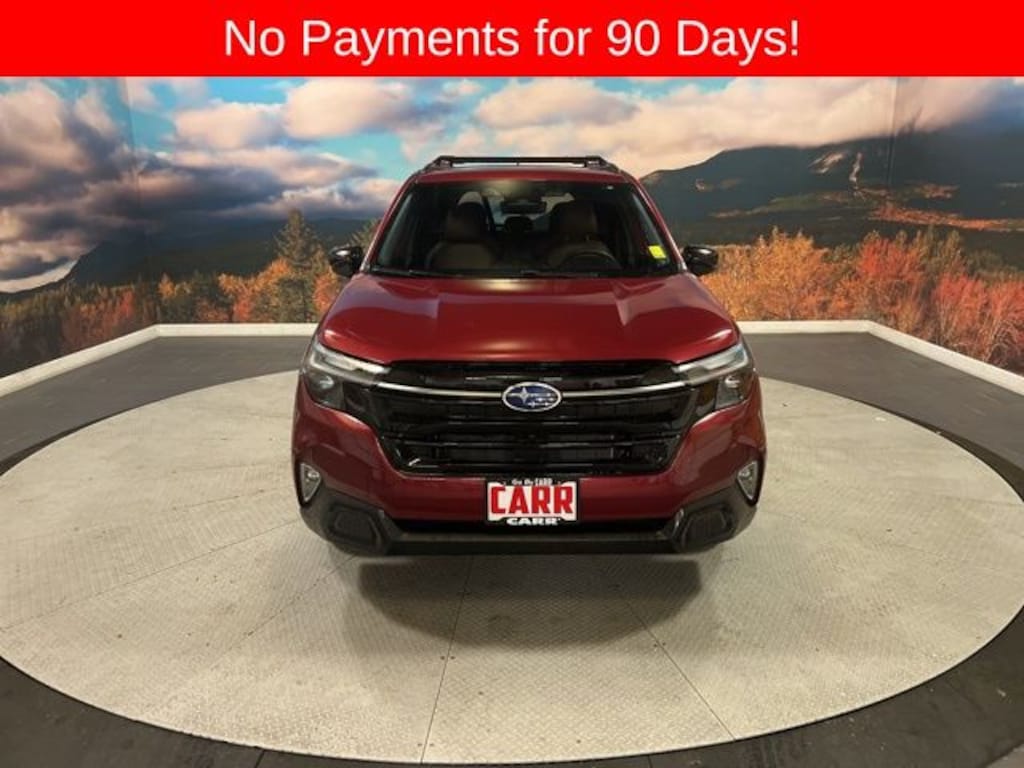 This 2025 Crimson Red Pearl Subaru Forester Touring AWD is well equipped and includes these features and benefits: Popular Package - Touring (Auto-Dimming Exterior Mirror w/Approach Light, Cargo Tray, LED Upgrade, Rear Bumper Cover, Rear Seatback Protector, and Splash Guards), Standard Model, Subaru Certified Pre-Owned Certified, 11 Speakers, 4-Wheel Disc Brakes, ABS brakes, Active Cruise Control, Air Conditioning, Alloy wheels, AM/FM radio: SiriusXM with 360L, Anti-whiplash front head restraints, Auto High-beam Headlights, Automatic temperature control, Brake assist, Bumpers: body-color, Cargo Cover, Crossbar Set - Aero, Driver door bin, Driver vanity mirror, Dual front impact airbags, Dual front side impact airbags, Electronic Stability Control, Emergency communication system: MySubaru Safety (3-year free trial), Exterior Parking Camera Rear, Four wheel independent suspension, Front anti-roll bar, Front Bucket Seats, Front Center Armrest, Front dual zone A/C, Front fog lights, Front reading lights, Fully automatic headlights, harman/kardon® Speakers, Heated & Ventilated Front Bucket Seats, Heated door mirrors, Heated front seats, Heated rear seats, Heated steering wheel, HVAC memory, Illuminated entry, Knee airbag, Leather steering wheel, Low tire pressure warning, Memory seat, Navigation System, Occupant sensing airbag, Outside temperature display, Overhead airbag, Overhead console, Panic alarm, Passenger door bin, Passenger vanity mirror, Perforated Leather-Trimmed Upholstery, Power door mirrors, Power driver seat, Power Liftgate, Power moonroof: Panoramic, Power passenger seat, Power steering, Power windows, Radio data system, Radio: Subaru 11.6" Multimedia Navigation System, Rear anti-roll bar, Rear seat center armrest, Rear window defroster, Rear window wiper, Remote keyless entry, Security system, Speed control, Speed-sensing steering, Split folding rear seat, Spoiler, Steering wheel mounted audio controls, Tachometer, Telescoping steering wheel, Tilt steering wheel, Traction control, Trip computer, Turn signal indicator mirrors, Variably intermittent wipers, Ventilated front seats, and Wheels: 19" x 7.5 J Dark Gray Aluminum-Alloy. Subaru Certified Pre-Owned, 7 year or 100,000-mile Subaru Certified warranty, No CARR payments for 4 months, Sign and Drive sales event!, CARR Cares Advantage up to $3100 in ownership savings, Touring, Auto-Dimming Exterior Mirror w/Approach Light, Cargo Tray, LED Upgrade, Popular Package - Touring, Rear Bumper Cover, Rear Seatback Protector, Splash Guards.