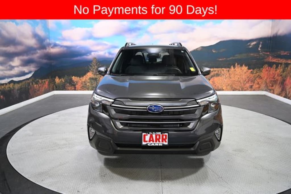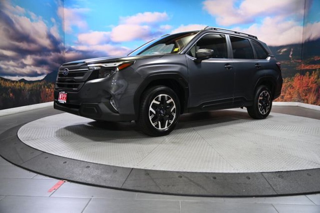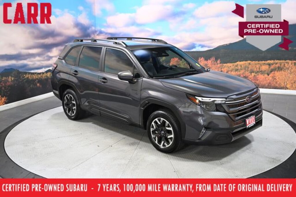 This 2025 Gray Metallic Subaru Forester Premium AWD is well equipped and includes these features and benefits: Convenience Package #1 (All-Weather Floor Liners, Auto-Dimming Mirror w/Compass & HomeLink, and Cargo Tray), Standard Model, Subaru Certified Pre-Owned Certified, 4-Wheel Disc Brakes, 6 Speakers, ABS brakes, Active Cruise Control, Air Conditioning, Alloy wheels, AM/FM radio: SiriusXM with 360L, Anti-whiplash front head restraints, Auto High-beam Headlights, Automatic temperature control, Brake assist, Bumpers: body-color, Cargo Cover, Driver door bin, Driver vanity mirror, Dual front impact airbags, Dual front side impact airbags, Electronic Stability Control, Exterior Parking Camera Rear, Four wheel independent suspension, Front anti-roll bar, Front Bucket Seats, Front Center Armrest, Front dual zone A/C, Front fog lights, Front reading lights, Fully automatic headlights, Heated door mirrors, Heated Front Bucket Seats, Heated front seats, Illuminated entry, Knee airbag, Leather steering wheel, LED Upgrade, Low tire pressure warning, Occupant sensing airbag, Outside temperature display, Overhead airbag, Overhead console, Panic alarm, Passenger door bin, Passenger vanity mirror, Power door mirrors, Power driver seat, Power moonroof: Panoramic, Power steering, Power windows, Premium Textured Cloth Upholstery, Radio data system, Rear anti-roll bar, Rear Bumper Cover, Rear seat center armrest, Rear window defroster, Rear window wiper, Remote keyless entry, Security system, Speed control, Speed-sensing steering, Split folding rear seat, Spoiler, Steering wheel mounted audio controls, Tachometer, Telescoping steering wheel, Tilt steering wheel, Traction control, Trip computer, Variably intermittent wipers, and Wheels: 17" x 7.0 J Dark Metallic Aluminum-Alloy. Subaru Certified Pre-Owned, 7 year or 100,000-mile Subaru Certified warranty, No CARR payments for 4 months, Sign and Drive sales event!, CARR Cares Advantage up to $3100 in ownership savings, All-Weather Floor Liners, Auto-Dimming Mirror w/Compass & HomeLink, Cargo Tray, Convenience Package #1.