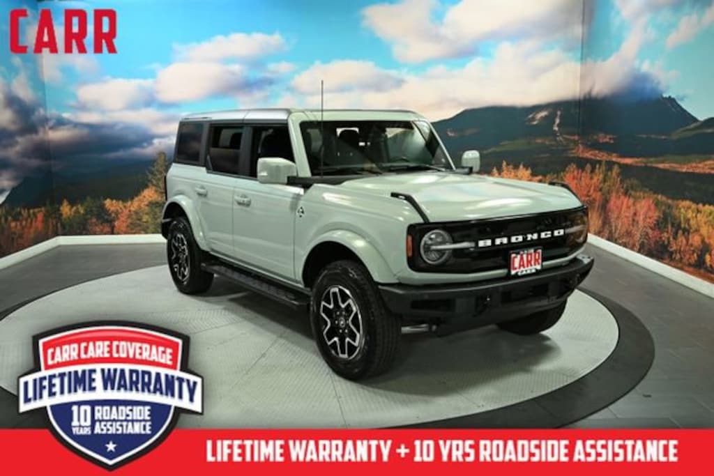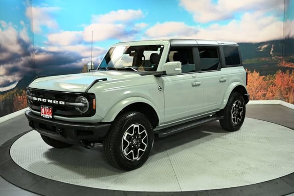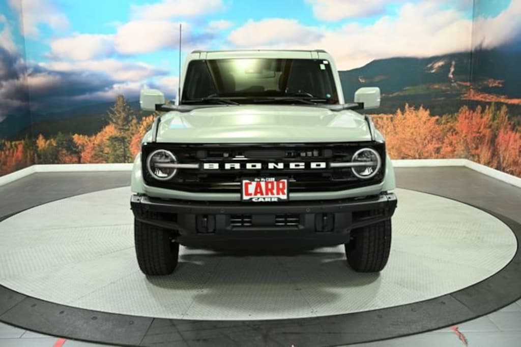 This 2023 Cactus Gray Ford Bronco Outer Banks Advanced 4WD is well equipped and includes these features and benefits: 4-Wheel Disc Brakes, 7 Speakers, ABS brakes, Air Conditioning, AM/FM radio: SiriusXM with 360L, AM/FM Stereo, Auto High-beam Headlights, Brake assist, Carbonized Gray Molded-In-Color Hard Top, Compass, Delay-off headlights, Driver door bin, Driver vanity mirror, Dual front impact airbags, Dual front side impact airbags, Electronic Stability Control, Emergency communication system: 911 Assist, Exterior Parking Camera Rear, Ford Performance Heavy-Duty Modular Front Bumper, Front & Rear Floor Liners w/o Carpet Floor Mats, Front anti-roll bar, Front Bucket Seats, Front Center Armrest, Front License Plate Bracket, Front reading lights, Front Row Top Panels Storage Bag, Front wheel independent suspension, Fully automatic headlights, Heated door mirrors, Illuminated entry, Integrated roll-over protection, Keyless Entry Keypad, Low tire pressure warning, Occupant sensing airbag, Outside temperature display, Overhead airbag, Overhead console, Panic alarm, Passenger door bin, Passenger vanity mirror, Power door mirrors, Power steering, Power windows, Radio data system, Remote keyless entry, Security system, SiriusXM Radio w/360L, Speed control, Split folding rear seat, Steering wheel mounted audio controls, SYNC 4, Tachometer, Telescoping steering wheel, Tilt steering wheel, Traction control, Trip computer, and Variably intermittent wipers.