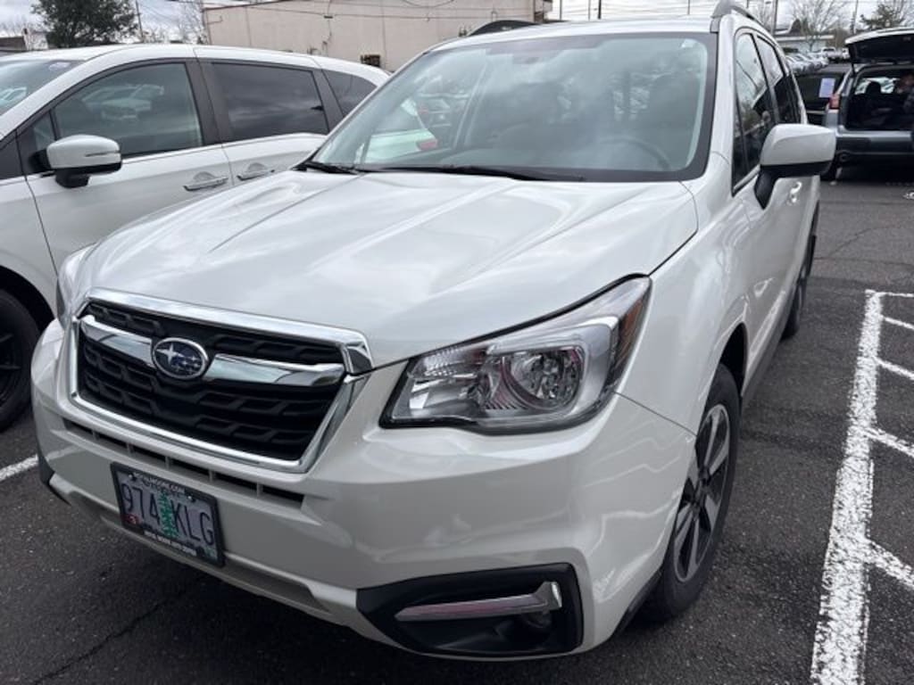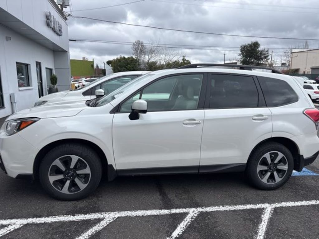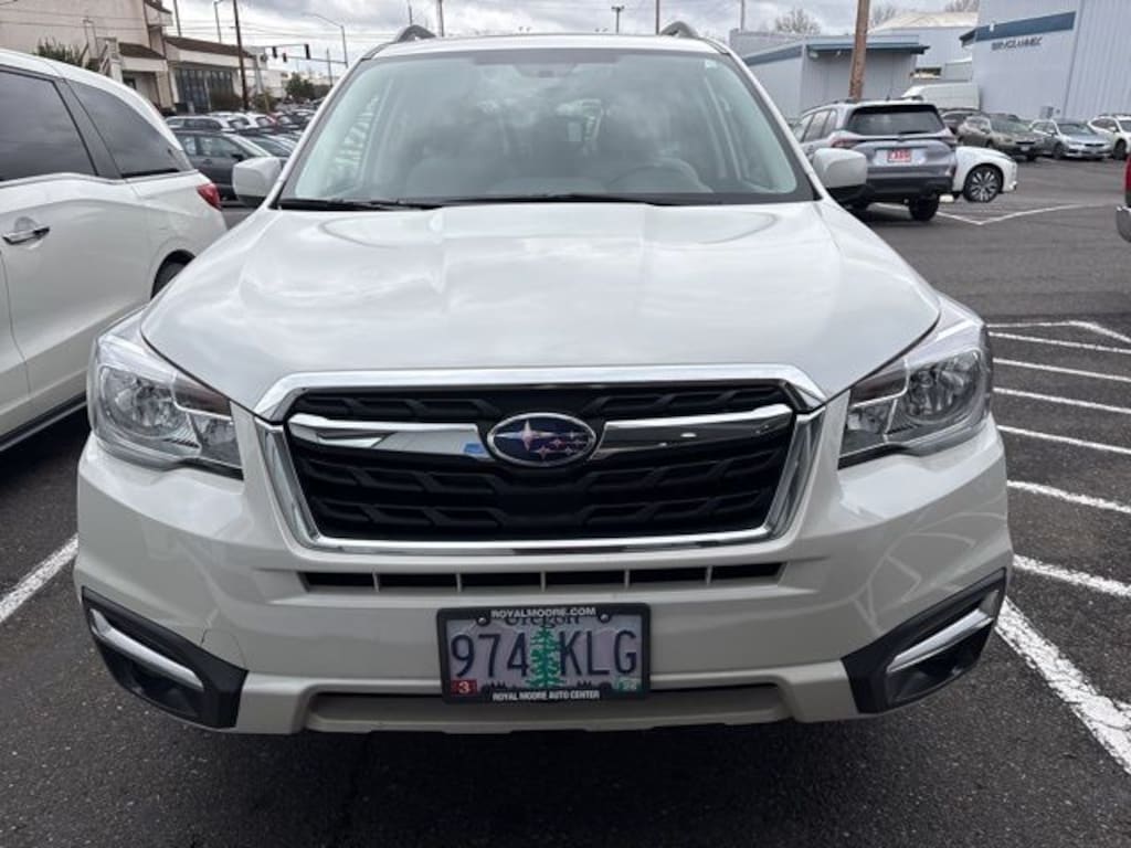 This 2018 Crystal White Pearl Subaru Forester 2.5i Premium AWD is well equipped and includes these features and benefits: 3.70 Axle Ratio, 4-Wheel Disc Brakes, 6 Speakers, ABS brakes, Air Conditioning, Alloy wheels, AM/FM radio: SiriusXM, Automatic temperature control, Brake assist, Bumpers: body-color, CD player, Driver door bin, Driver vanity mirror, Dual front impact airbags, Dual front side impact airbags, Electronic Stability Control, Emergency communication system: STARLINK, Exterior Parking Camera Rear, Four wheel independent suspension, Front anti-roll bar, Front Bucket Seats, Front Center Armrest, Front reading lights, Illuminated entry, Knee airbag, Low tire pressure warning, Occupant sensing airbag, Outside temperature display, Overhead airbag, Overhead console, Panic alarm, Passenger door bin, Passenger vanity mirror, Power door mirrors, Power driver seat, Power moonroof, Power steering, Power windows, Radio data system, Radio: Subaru Starlink 7.0" Multimedia Plus System, Rear anti-roll bar, Rear seat center armrest, Rear window defroster, Rear window wiper, Remote keyless entry, Roof rack: rails only, Security system, Speed control, Split folding rear seat, Spoiler, Steering wheel mounted audio controls, Tachometer, Telescoping steering wheel, Tilt steering wheel, Traction control, Trip computer, and Variably intermittent wipers.