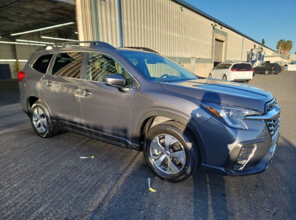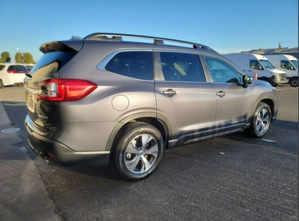 This 2024 Gray Metallic Subaru Ascent Premium AWD is well equipped and includes these features and benefits: Convenience Package (Auto-Dimming Rear View Compass Mirror w/HomeLink, Keyless Access w/Push-Button Start, Power Rear Gate w/Automatic Close & Height Memory, and Reverse Automatic Braking (RAB) System), 3rd row seats: bench, 4-Wheel Disc Brakes, 6 Speakers, ABS brakes, Air Conditioning, Alloy wheels, AM/FM radio: SiriusXM, Auto High-beam Headlights, Automatic temperature control, Axle Ratio: 4.44, Brake assist, Bumpers: body-color, Delay-off headlights, Driver door bin, Driver vanity mirror, Dual front impact airbags, Dual front side impact airbags, Electronic Stability Control, Emergency communication system: STARLINK Safety and Security (Subscription Required), Exterior Parking Camera Rear, Four wheel independent suspension, Front anti-roll bar, Front Bucket Seats, Front Center Armrest, Front dual zone A/C, Front reading lights, Fully automatic headlights, Heated door mirrors, Heated Front Bucket Seats, Heated front seats, Illuminated entry, Knee airbag, Leather Shift Knob, Leather steering wheel, Low tire pressure warning, Occupant sensing airbag, Outside temperature display, Overhead airbag, Overhead console, Panic alarm, Passenger door bin, Passenger vanity mirror, Power door mirrors, Power driver seat, Power steering, Power windows, Radio data system, Radio: Subaru STARLINK 11.6" Multimedia Plus System, Rear air conditioning, Rear anti-roll bar, Rear reading lights, Rear window defroster, Rear window wiper, Reclining 3rd row seat, Remote keyless entry, Security system, Speed control, Speed-sensing steering, Spill Resistant Coated Cloth Upholstery, Split folding rear seat, Spoiler, STARLINK/Apple CarPlay/Android Auto, Steering wheel mounted audio controls, Tachometer, Telescoping steering wheel, Tilt steering wheel, Traction control, Trip computer, Turn signal indicator mirrors, Variably intermittent wipers, and Wheels: 18" x 7.5 J Gray Alloy w/Machine Finish.