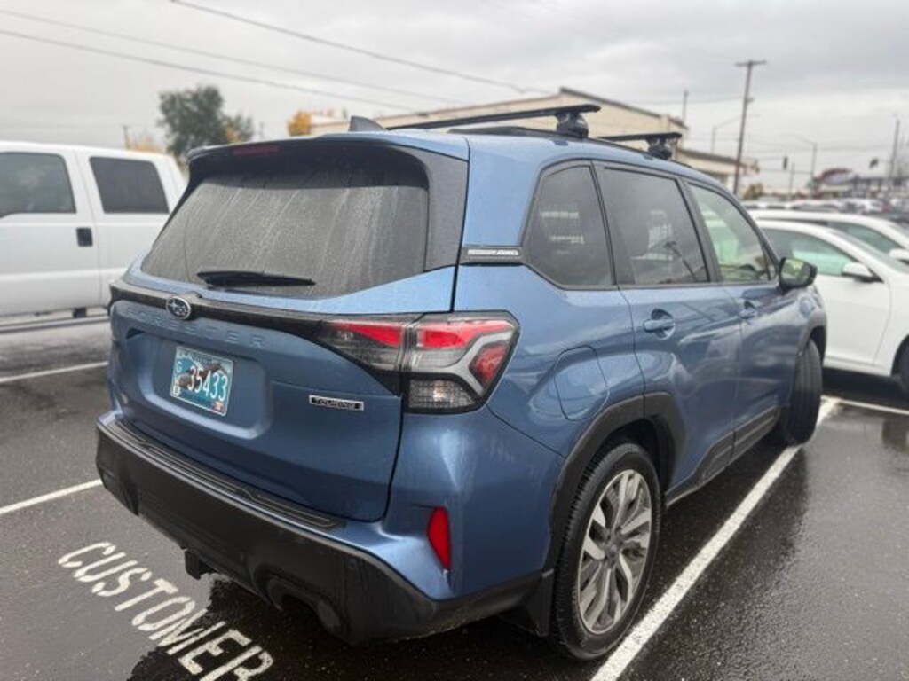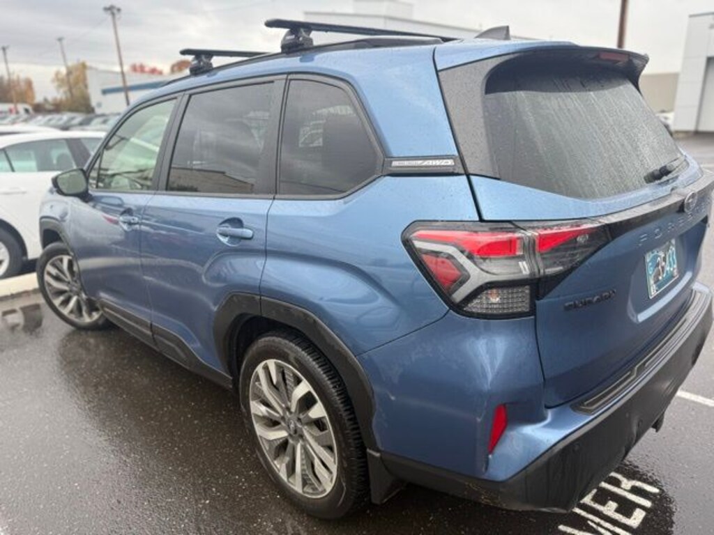 This 2025 Horizon Blue Pearl Subaru Forester Touring AWD is well equipped and includes these features and benefits: 11 Speakers, 4-Wheel Disc Brakes, ABS brakes, Air Conditioning, Alloy wheels, AM/FM radio: SiriusXM with 360L, Anti-whiplash front head restraints, Auto High-beam Headlights, Automatic temperature control, Brake assist, Bumpers: body-color, Driver door bin, Driver vanity mirror, Dual front impact airbags, Dual front side impact airbags, Electronic Stability Control, Emergency communication system: MySubaru Safety (3-year free trial), Exterior Parking Camera Rear, Four wheel independent suspension, Front anti-roll bar, Front Bucket Seats, Front Center Armrest, Front dual zone A/C, Front fog lights, Front reading lights, Fully automatic headlights, harman/kardon® Speakers, Heated & Ventilated Front Bucket Seats, Heated door mirrors, Heated front seats, Heated rear seats, Heated steering wheel, HVAC memory, Illuminated entry, Knee airbag, Leather steering wheel, Low tire pressure warning, Memory seat, Navigation System, Occupant sensing airbag, Outside temperature display, Overhead airbag, Overhead console, Panic alarm, Passenger door bin, Passenger vanity mirror, Perforated Leather-Trimmed Upholstery, Power door mirrors, Power driver seat, Power Liftgate, Power moonroof: Panoramic, Power passenger seat, Power steering, Power windows, Radio data system, Radio: Subaru 11.6" Multimedia Navigation System, Rear anti-roll bar, Rear seat center armrest, Rear window defroster, Rear window wiper, Remote keyless entry, Security system, Speed control, Speed-sensing steering, Split folding rear seat, Spoiler, Steering wheel mounted audio controls, Tachometer, Telescoping steering wheel, Tilt steering wheel, Traction control, Trip computer, Turn signal indicator mirrors, Variably intermittent wipers, Ventilated front seats, and Wheels: 19" x 7.5 J Dark Gray Aluminum-Alloy.